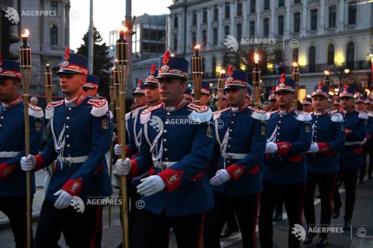 * Explicaţie foto: Retragere cu torţe a militarilor Gărzii de Onoare a Jandarmeriei Române pe traseul: Cercul Militar Naţional – Calea Victoriei – Pod Naţiunile Unite – Splaiul Independenţei – Bulevardul Unirii – Piaţa Constituţiei din Bucureşti, cu prilejul Zilei Jandarmeriei Române.
