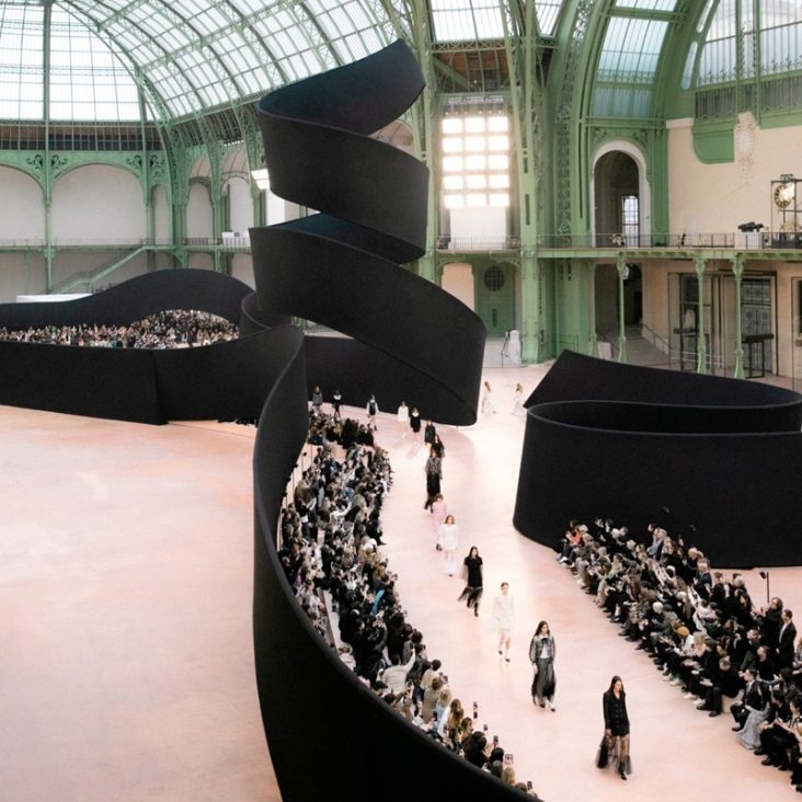 Chanel a deschis show-ul cu prezentarea sa obişnuită în centrul navei Grand Palais, unde o panglică neagră monumentală şerpuia până la tavan.