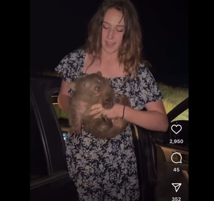 Jones a distribuit pe Instagram imagini cu ea apropiindu-se şi apoi luând în braţe puiul de wombat în timp ce acesta se plimba cu mama sa într-un loc necunoscut.