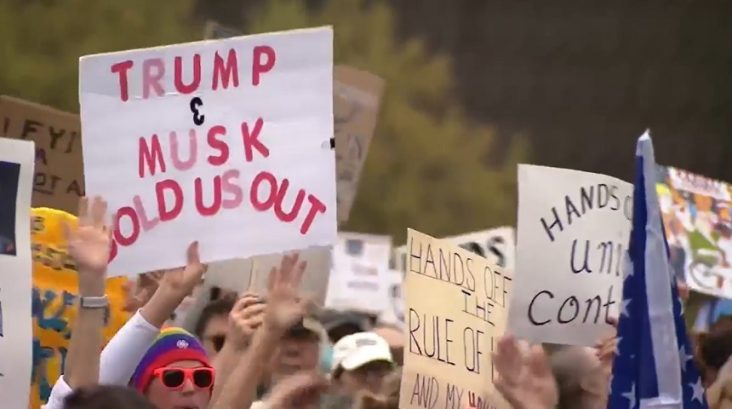 Mii de protestatari din oraşele din întreaga ţară, de la Midtown Manhattan la Anchorage, Alaska, inclusiv în capitalele mai multor state, au atacat acţiunile lui Trump şi ale miliardarului Elon Musk privind reducerea guvernului, economia, imigraţia şi drepturile omului. Pe Coasta de Vest, în umbra emblematicului Space Needle din Seattle, protestatarii au purtat pancarte cu sloganuri precum „Luptaţi împotriva oligarhiei”. Protestatarii au scandat în timp ce au ieşit în stradă în Portland, Oregon, şi Los Angeles, unde au mărşăluit din Pershing Square până la primărie.