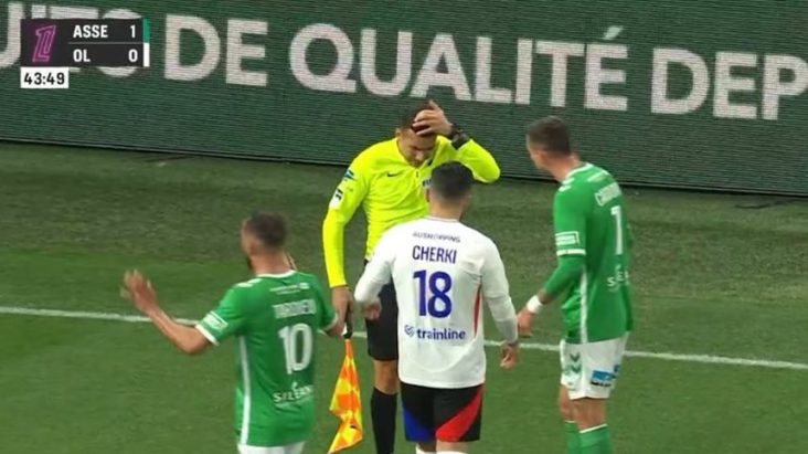 Meciul a fost întrerupt în minutul 45, după ce arbitrul asistent Mehdi Rahmouni a fost lovit în cap de un obiect aruncat de la tribună, chiar înainte de pauza primei reprize a meciului Saint-Etienne-Lyon. Arbitrul François Letexier a trimis ambele echipe la vestiare înainte de convocarea unei celule de criză, iar meciul a fost reluat după aproximativ 45 de minute.