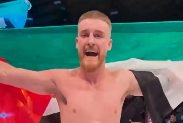 Paddy McCorry ???????? Destroyed Israeli fighter Shuki Farage ???????? he then raised the Palestine flag and said “FREE PALESTINE!” pic.twitter.com/R7DIrOrOlk