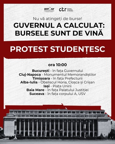 Alianţa Naţională a Organizaţiilor Studenţeşti din România (ANOSR) organizează, joi, proteste în Bucureşti şi în mai multe centre universitare din ţară, faţă de intenţia Guvernului de a reduce fondurile alocate pentru burse şi numărul beneficiarilor.