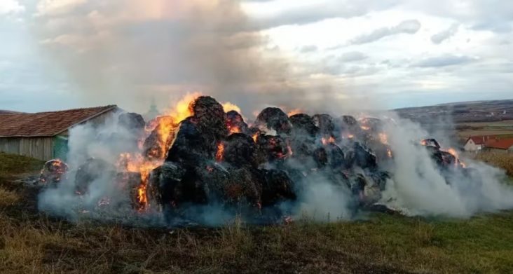 Informaţiile iniţiale arătau că incendiul a cuprins în jur de 1.000 de baloţi de paie.