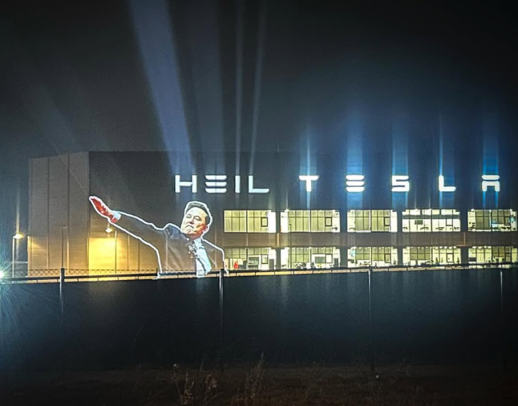 În proiecţie apare cuvântul ”Heil” alături de firma luminoasă a fabricii de maşini electrice, formând împreună un ”Heil Tesla”, o trimitere la salutul hitlerist.
