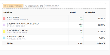 Datele după centralizarea proceselor verbale de la cele două secţii de votare din omuna Şieu din Maramureş arată că scrutinul a fost câştigat de candidatul PSD, Ioana Rus.