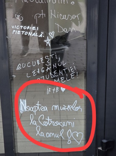 Ea a distribuit o fotografie cu mesajul ”Noaptea Muzeelor la Cotroceni, la anul”, scris pe un geam de la Primăria Capitalei.
