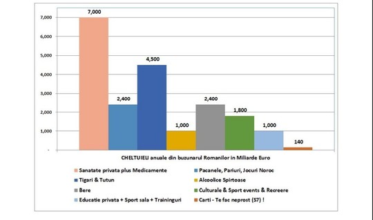 – 2,4 miliarde euro anual cheltuiţi pe pariuri şi alte jocuri de noroc  versus doar 140 milioane euro pe cărţi (o proporţie de 1/16)