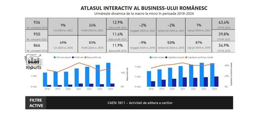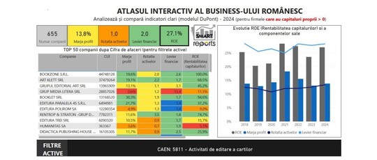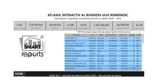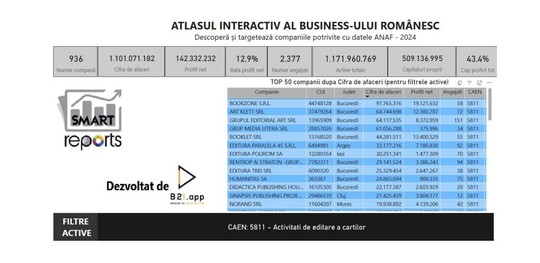 Analizând sectorul pe CAEN 5811 ”editare CĂRŢI”+ CAEN 5819 ”alte activităţi de editare” (aici intră şi jocurile tip boardgames şi altele), pe baza platformei SmartReport dezvoltată de Bridge-2-Information, obţinem: