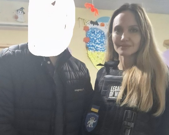 Un oficial local, Vitali Bogdanov, a publicat pe Facebook o forografie în care Angelina Jolie apare purtând o vestă antiglonţ cu insigne ucrainene.