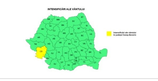 Meteorologii au emis o atenţionare cod galben de vânt pentru judeţul Caraş-Severin, valabilă până miercuri, existând posibilitatea ca şi în alte regiuni să existe intensificări ale vântului.