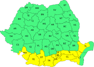 Meteorologii au emis, luni, cod galben de temperaturi deosebit de ridicate, valabil luni, 9 iunie, până la ora 21.00, pentru vestul şi sudul Olteniei, jumătatea de sud a Munteniei şi Dobrogea continentală. Potrivit aceleiaşi surse, temperaturile maxime vor fi cuprinse între 31 şi 34 de grade. Meteorologii au emis şi un cod galen de averse torenţiale, vijelii şi grindină în estul Olteniei, cea mai mare parte a Munteniei şi în jumătatea sudică a Moldovei, cu vânt de până la 70 de km/h şi izolat cantităţi de apă de peste 40 de litri pe metru pătrat.