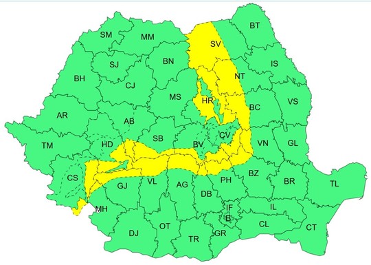 O atenţionare meteorologică cod galben a fost emisă pentru perioada  09 ianuarie, ora 10:00 – 09 ianuarie, ora 17:00, când sunt anunţate intensificări ale vântului, zăpadă viscolită în Carpaţii Meridionali şi în cea mai mare parte a Carpaţilor Orientali