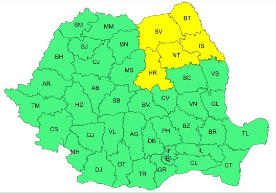 O altă atenţionare meteorologică cod galben intră în vigoare de vineri seară, de la ora 20.00, până duminică, la aceeaşi oră., fiind prognozate temperaturi deosebit de scăzute, ger, în nordul Moldovei şi estul Transilvaniei