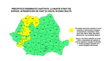 În zona montană şi submontană a judeţelor Caraş-Severin, Hunedoara, Timiş, Arad, Alba, Bihor, Satu Mare, Sălaj, Maramureş, Cluj şi Bistriţa-Năsăud, temporar vor fi precipitaţii însemnate cantitativ şi se vor acumula 20…30 l/mp. Vor fi ploi ce vor avea şi caracter de aversă, iar la altitudini în general de peste 1.400 de metri, vor predomina ninsorile şi se va depune strat de zăpadă de 10…25 cm. În zona montană înaltă a Carpaţilor Occidentali, precum şi în cea din nordul Carpaţilor Orientali şi vestul Carpaţilor Meridionali vântul va prezenta intensificări cu viteze de 60…90 km/h, astfel va fi viscol, iar vizibilitatea va scădea sub 100 de metri.