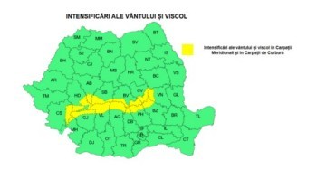 De marţi, de la ora 20.00, până miercuri, la ora 10.00, va fi Cod galben de intensificări ale vântului şi viscol în Carpaţii Meridionali şi Carpaţii de Curbură, unde vântul va continua să prezinte intensificări cu viteze de 60…85 km/h, iar la altitudini de peste 1.700 de metri, rafalele vor atinge 90…110 km/h şi va fi viscol, astfel că vizibilitatea va fi redusă semnificativ.