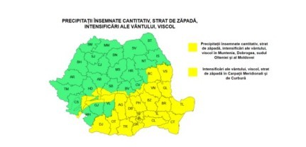 Totodată, ANM a emis o atenţionare Cod galben de precipitaţii însemnate cantitativ, strat de zăpadă, intensificări ale vântului, viscol, valabilă de marţi, de la ora 10.00, până miercuri, la ora 14.00. În intervalul menţionat, în sudul Olteniei, Muntenia, Dobrogea şi sudul Moldovei vor fi precipitaţii însemnate cantitativ. Ziua vor fi precipitaţii mixte (ploaie, lapoviţă, ninsoare) în Oltenia şi Muntenia, ploi în Dobrogea şi ninsori în Moldova. Noaptea vor predomina ninsorile. Se vor acumula cantităţi de precipitaţii de 25…30 l/mp şi izolat de peste 40 l/mp. Se va depune strat de zăpadă în medie de 10…30 cm. Vântul va avea intensificări cu viteze la rafală de 50…70 km/h, va fi viscol şi vizibilitatea redusă sub 100 de metri.