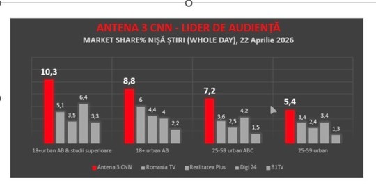”Pe orice target Antena 3 CNN a fost liderul pieţei de stiri din România. Pe segmentul 25-59 Urban, postul a înregistrat 5,4% share pe Whole Day, peste Digi24, România TV sau Realitatea Plus. Ordinea s-a repetat pe toate targeturile inclusiv 18 plus urban sau 25-59 urban ABC. De altfel, pe targetul 25-59, în mai multe momente de-a lungul zilei, cota de piaţă a postului nostru a fost peste cea a Realitatea Plus şi Romania TV la un loc”, potrivit unui comunicat.