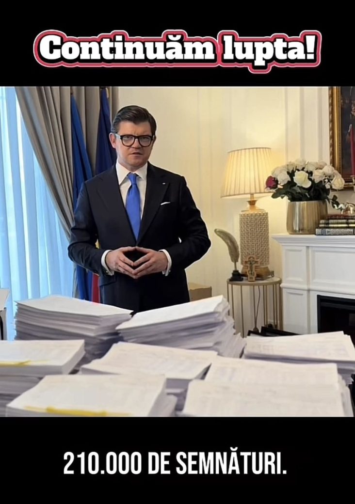”Dragi români, dragi prieteni, dragi luptători în numele adevărului, Da, am reuşit să strâng puţin peste 210.000 de semnături. Vă mulţumesc din suflet! Mulţumesc tuturor pentru mobilizarea excelentă, pentru tot sprijinul! Mulţumesc din inimă tuturor celor care aţi strâns semnături pentru mine, pentru cauza noastră. Mulţumesc românilor din diaspora, mai ales comunităţilor din Italia şi Marea Britanie, pentru efortul făcut. Mulţumesc echipei mele.Mulţumesc copiilor mei Patrick şi Annemarie, mutumesc tuturor celor care mi-au fost aproape. Împreună, cu toţii, am făcut o minune”, a afirmat Anton Pisaroglu, într-un comunicat de presă publicat sâmbătă după-amiază, pe Facebook.