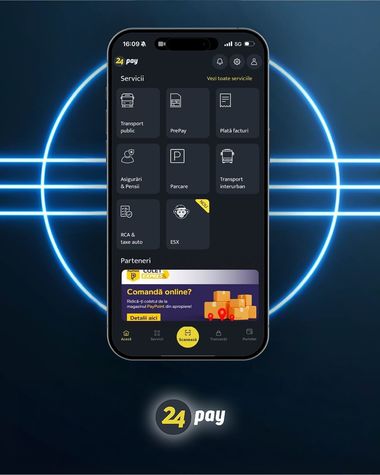 Aplicaţia 24pay este disponibilă pentru sistemele de operare Android şi iOS. Pentru utilizarea aplicaţiei, este necesară adăugarea iniţială a unui card bancar Visa sau Mastercard.