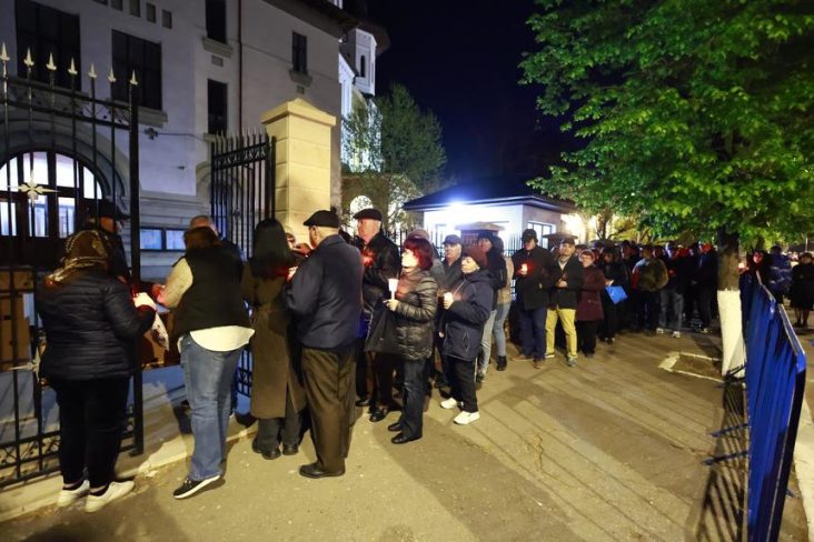 Înaltpreasfinţitul Ciprian, care a împlinit sâmbătă 60 de ani, a ieşit din catedrală la miezul nopţii şi i-a îndemnat pe credincioşi să vină să ia Lumina Sfântă, după care a oficiat slujba de Înviere şi a rostit un cuvânt pastoral înainte de a reintra în locaşul de cult pentru Sfânta Liturghie.