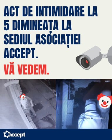 Asociaţia Accept reclamă o nouă încercare de intimidare la adresa comunităţii şi a organizaţiilor LGBTI, după ce o persoană a încercat să intre în sediul asociaţei, dar văzând că zona este monitorizată de camere a lovit interfonul şi a plecat. Asociaţia subliniază că autorităţile trebuie ”să intervină ferm atunci când apar acte de intimidare şi infracţiuni motivate de ură”. ”A folosi comunitatea LGBTI ca armă în lupta politică nu este doar josnic – este periculos”, adaugă reprezentanţii acesteia.