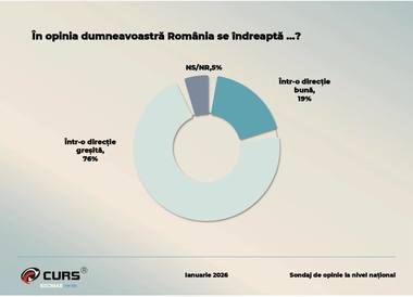 Percepţia populaţiei privind direcţia ţării rămâne covârşitor negativă. 76% dintre români consideră că România se îndreaptă într-o direcţie greşită, în timp ce doar 19% apreciază că direcţia este una bună, iar 5% nu au o opinie clar formulată.