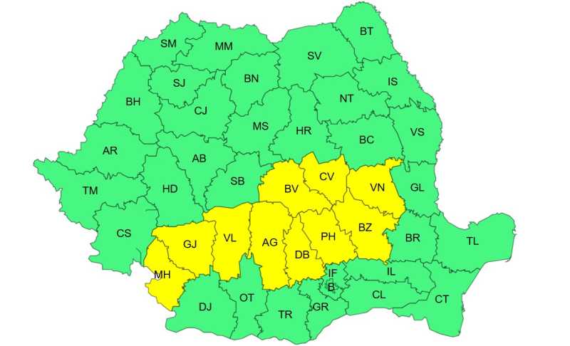 Potrivit meteorologilor, pe parcursul acestei zile, între orele 12:00 – 21:00, în județele Mehedinți, Gorj, Vâlcea, Argeș, Dâmbovița, Prahova, Buzău, Vrancea, Brașov și Covasna vor fi perioade cu instabilitate atmosferică accentuată, ce se va manifesta prin averse torențiale, descărcări electrice, intensificări ale vântului (rafale de 50 – 55 km/h) și izolat vijelii și grindină.