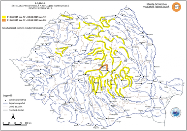 Codul galben este valabil în intervalul 1 iunie ora 14:00 – 2 iunie ora 12:00 şi pe râurile din bazinele hidrografice Vişeu – bazin superior şi afluenţi bazin mijlociu şi inferior, Iza – bazin superior şi afluenţi bazin mijlociu şi inferior, Lăpuş – bazin superior şi afluenţi bazin mijlociu şi inferior (judeţul Maramureş), Tur (judeţul Satu Mare), Someşul Mare – bazin superior şi afluenţi bazin mijlociu şi inferior (judeţul Bistriţa Năsăud), Someşul Mic – bazin amonte Ac. Gilău (judeţele: Bihor şi Cluj), Mureş – bazin amonte S.H. Gălăoaia şi afluenţii aferenţi sectorului aval S.H. Gălăoaia – amonte S.H. Luduş (judeţele: Harghita, Mureş şi Bistriţa Năsăud), Târnava Mică – bazin amonte S.H. Bălăuşeri (judeţele: Harghita şi Mureş), Tărnava Mare – bazin amonte S.H. Sighişoara (judeţele: Harghita, Mureş şi Braşov), Arieş – bazin superior şi afluenţi bazin mijlociu şi inferior (judeţele: Alba şi Cluj), Olt – bazin amonte S.H. Micfalău şi afluenţii aferenţi sectorului aval S.H. Micfalău – amonte S.H Sebeş Olt (judeţele: Harghita, Covasna, Braşov şi Sibiu), Argeş – bazin superior, Dâmboviţa – bazin superior (judeţele: Argeş şi Dâmboviţa), Ialomiţa – bazin amonte S.H. Moroeni şi afluenţii aferenţi sectorului aval S.H. Moroeni – amonte S.H. Siliştea Snagovului (judeţele: Dâmboviţa, Prahova şi Ilfov), Prahova – bazin superior şi afluenţi bazin mijlociu şi inferior (judeţul Prahova), Buzău – bazin amonte Ac. Siriu şi afluenţii aferenţi sectorului aval Ac. Siriu – amonte S.H. Baniţa (judeţele: Braşov, Covasna, Buzău şi Prahova), Suceava – bazin superior şi afluenţi bazin mijlociu şi inferior (judeţul Suceava), Moldova – bazin superior şi afluenţi bazin mijlociu şi inferior (judeţele: Suceava şi Neamţ), Bistriţa – bazin superior şi afluenţi bazin mijlociu şi inferior (judeţele: Suceava, Neamţ, Harghita şi Bacău), Trotuş – bazin amonte S.H. Ghimeş Făget şi afluenţii aferenţi sectorului aval S.H. Ghimeş Făget – amonte S.H. Vrânceni (judeţele: Harghita, Bacău, Neamţ şi Covasna), Putna – bazin superior (judeţul Vrancea), Râmnicu Sӑrat – bazin superior şi afluenţi bazin mijlociu şi inferior (judeţele: Buzău şi Vrancea).