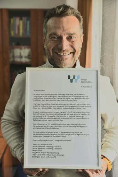 În numele World Open Water Swimming Federation, am onoarea să vă felicit pentru atingerea obiectivului dumneavoastră fără precedent, reuşind să finalizaţi Triple Crown of River Stage Swims în perioada 29 iunie – 8 august 2025, când aţi parcurs înot cei 556 km pe râul Main şi Canalul Dunării.