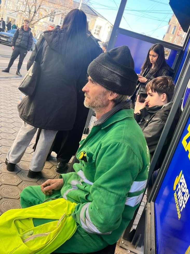Incidentul s-a petrecut în staţia Piaţa Unirii din centrul municipiului Iaşi, iar bărbatul surprins în imagini este îmbrăcat într-o salopetă a societăţii locale de salubritate.