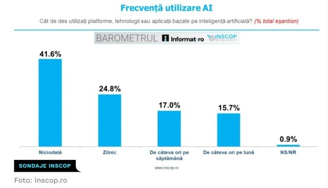 BAROMETRUL Informat.ro – INSCOP Research: Un sfert dintre români spun că folosesc zilnic platforme, tehnologii sau aplicaţii bazate pe inteligenţă artificială iar 41.6% nu le utilizează niciodată