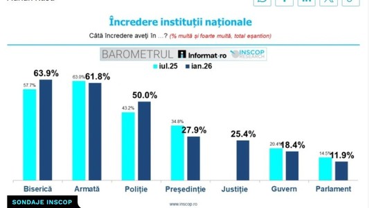 Biserica este instituţia în care românii au cea mai mare încredere, 63.9% declarând că au destul de multă şi foarte multă încredere în această instituţie (faţă de 57.7% în iulie 2025). Urmează Armata, cu un capital de încredere de 61.8% (faţă de 63% în iulie 2025) şi Poliţia cu 50% (faţă de 43.2% în iulie 2025).