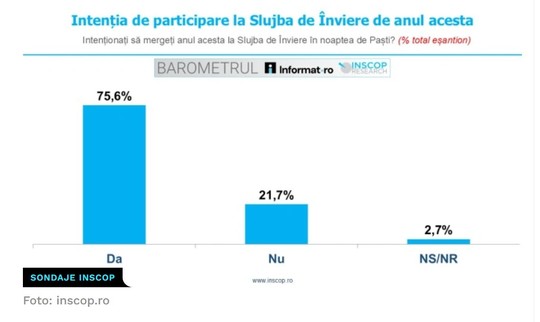 75.6% dintre cei chestionaţi afirmă că intenţionează să meargă anul acesta la Slujba de Înviere. La polul opus, 21.7% spun că nu intenţionează acest lucru. 2.7% nu ştiu sau nu răspund.