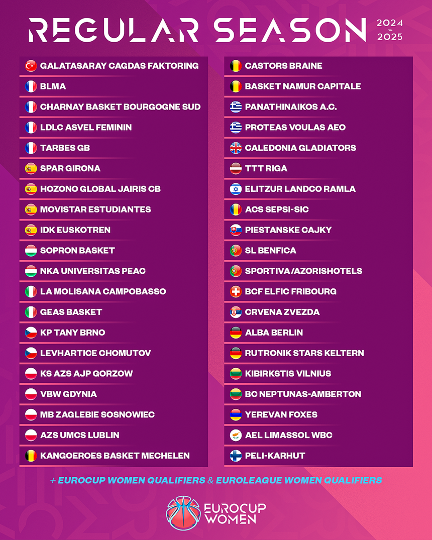 La startul sezonul 2024-2025 se vor afla 50 de cluburi, din care 43 repartizate direct în sezonul regulat. Acestea includ şi trei locuri pentru echipe învinse în preliminariile Euroligii. Alte cinci locuri sunt rezervate pentru câştigătoarele din preliminariile EuroCup, pentru un total de 48 de participante.