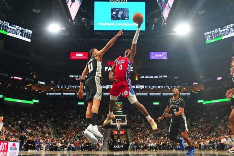Joel Embiid a înscris cele mai multe puncte pentru 76ers, 34, în timp ce Stephon Castle a reușit o triplă dublă (categorie statistică de peste zece unități) pentru Spurs, cu 19 puncte, 10 recuperări și 13 pase decisive.