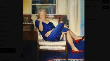 Bill Clinton apare în tablou în travesti, purtând o rochie albastă şi pantofi cu toc roşii, aşezat pe un fotoliu, în Biroul Oval, un fel de ”Oncle Sam” al lui James Montgomery Flagg.