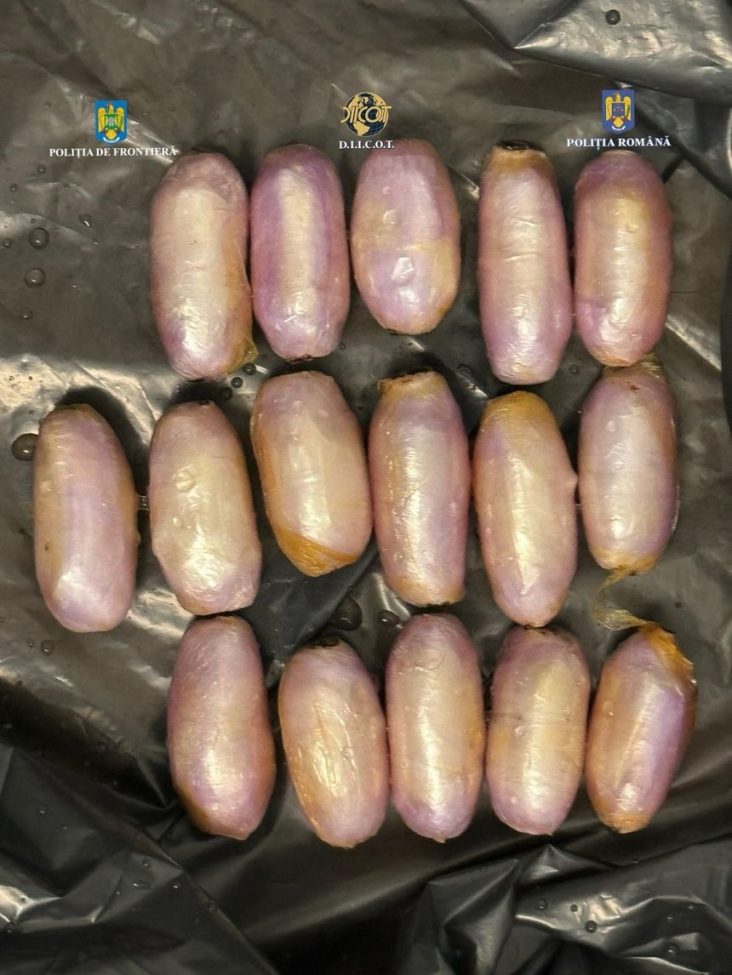 Un cetăţean brazilian în vârstă de 26 de ani a fost prins, în urmă cu trei zile, de către poliţişti, pe Aeroportul Henri Coandă, din Otopeni, având asupra sa, fixate pe picioare cu bandă adezivă, două pachete ce conţineau aproximativ o jumătate de kilogram de cocaină, porţionată în 78 de caşete. De asemenea, la controlul cu un scanner cu raze X poliţiştii au văzut, în stomacul bărbatului, „formaţiuni neobişnuite” pentru anatomia umană. Dus la spital, brazilianul a eliminat 62 de caşete conţinând în jur de 350 de grame de substanţă pulverulentă, în curs de expertizare, susceptibilă a fi cocaină. Presupusul traficant a fost arestat preventiv.