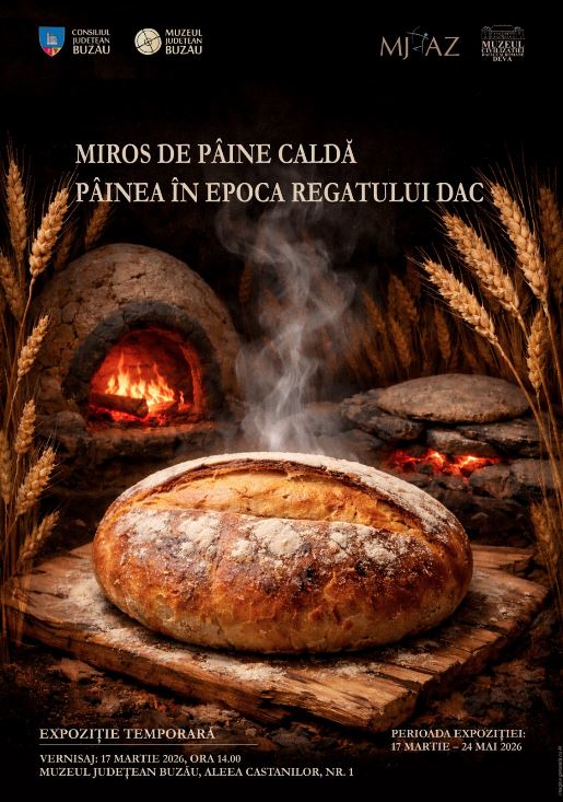 Expoziția ‘Miros de pâine caldă. Pâinea în epoca Regatului Dac’ va fi deschisă publicului în perioada 17 martie – 24 mai 2026. Vernisajul expoziției se va desfășura în data de 17 martie la sediul Muzeului de Arheologie, Istorie și Artă din Buzău, accesul fiind gratuit.