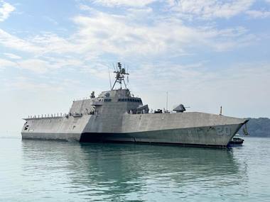 USS Cincinnati (LCS-20), un vas conceput pentru luptă în zona litorală, a acostat în cursul dimineţii, la aproximativ 150 de metri de două nave ale armatei chineze.