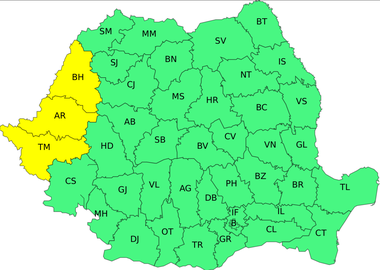 Meteorologii au emis, joi, cod galben de caniculă pentru judeţele Timiş, Arad şi Bihor şi atenţionează că vineri de la prânz şi până la ora 21.00 se vor înregistra temperaturi deosebit de ridicate, ce vor ajunge până la 37 de grade. De asemenea, potrivit sursei citate, indicele temperatură-umezeală va atinge, pe arii restrânse, pragul critic de 80 de unităţi.