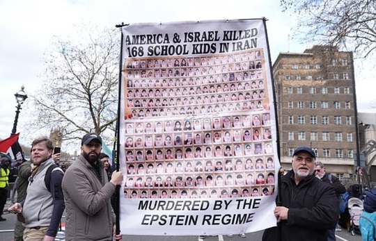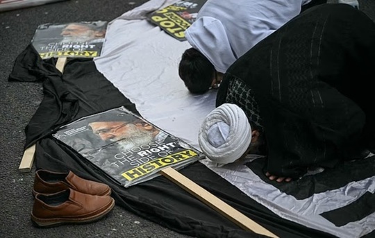 Pe alte pancarte se aflau portrete ale ayatollahului Ali Khamenei, liderul suprem iranian ucis în prima zi a Răznoiului lansat de către Statele Unite şi Israel în Iran, la 28 februarie.