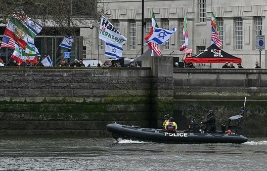 Contramanifestanţi s-au adunat de cealaltă parte a Tamisei, agitând steaguri americane şi israeliene.