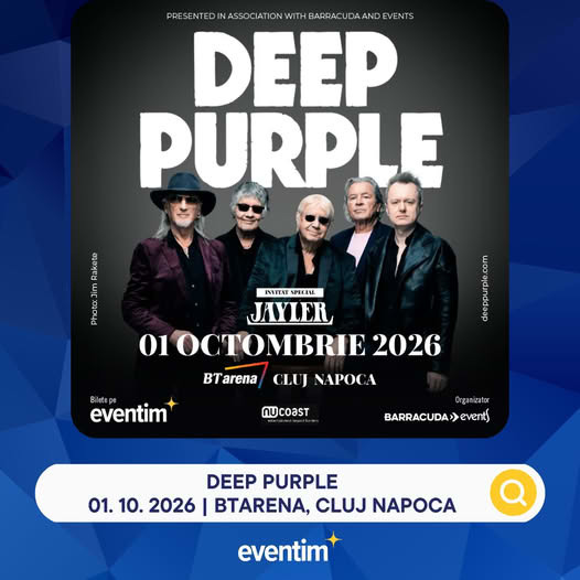 Deep Purple a anunţat un concert la BTarena Cluj-Napoca, la 1 octombrie, în cadrul turneului internaţional “=1 More Time Tour”. Celebră pentru că a definit sunetul rockului timp de mai bine de cinci decenii, Deep Purple rămâne una dintre cele mai apreciate formaţii live din lume. Alături de Deep Purple va fi compozitorul, vocalistul, multi-instrumentistul şi producătorul nominalizat la premiile Grammy, Wolfgang Van Halen, precum şi trupa britanică de rock Jayler, aflată în plină ascensiune.