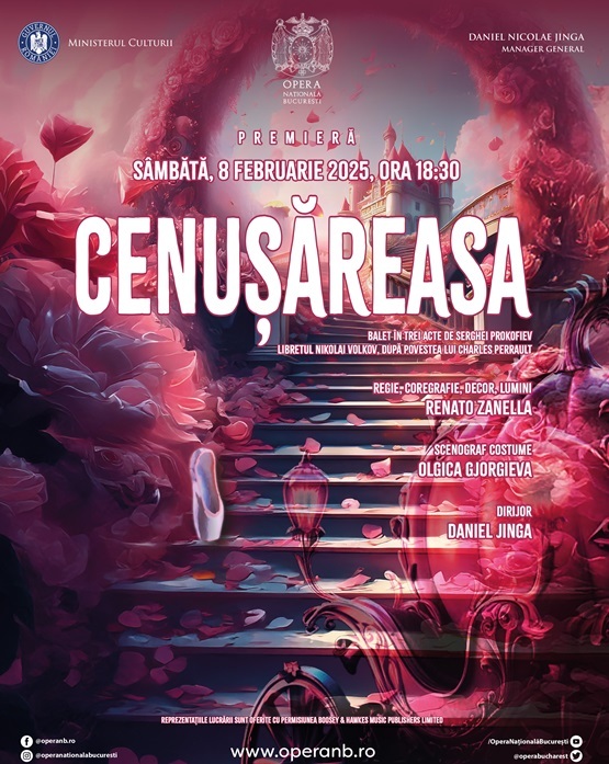 Opera Naţională Bucureşti prezintă în luna dedicată iubirii, pe 8 februarie, ora 18:30, premiera de balet „Cenuşăreasa” de Serghei Prokofiev, o poveste despre triumful binelui, puterea dragostei adevărate şi speranţa care poate transforma chiar şi cele mai grele încercări într-un final fericit. Regia şi coregrafia poartă semnătura lui Renato Zanella. La pupitrul dirijoral se va afla maestrul Daniel Jinga. Pentru prima reprezentaţie cu titlu de premieră protagoniştii vor fi prim-balerinii Cristina Dijmaru şi Bogdan Cănilă, cu participarea Ansamblului de Balet şi a Orchestrei Operei Naţionale Bucureşti.