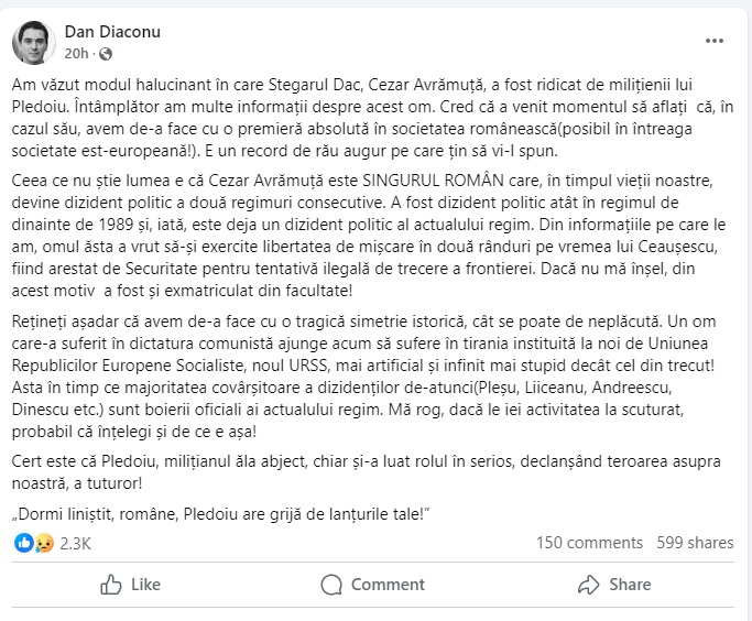 „Dormi liniștit, române, Pledoiu are grijă de lanțurile tale!” – scrie Dan Diaconu pe pagina sa de facebook.