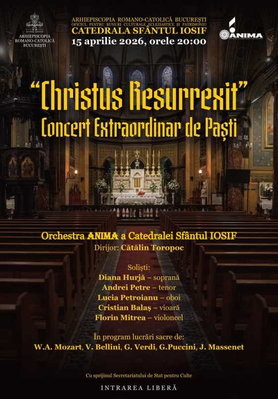 Un concert al Orchestrei Anima, moment de bucurie și comuniune prin muzică sacră dedicat tuturor creștinilor care au celebrat Sfintele Paști, va avea loc miercuri la Catedrala ‘Sfântul Iosif’ din București.