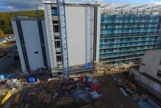 Cădirea Secţiei Oncologie medicală este iluminată în roz.