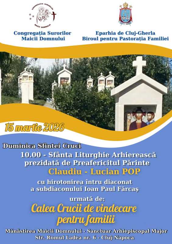 ‘În Duminica Sfintei Cruci, 15 martie 2026 – cea de-a treia a Postului Mare -, Preafericirea Sa Claudiu, Arhiepiscopul Major al Bisericii Române Unite cu Roma, Greco-Catolică și Păstor al Eparhiei de Cluj-Gherla va celebra Sfânta Liturghie la Mănăstirea Maicii Domnului – Sanctuar Arhiepiscopal Major din Cluj-Napoca (str. Romul Ladea, nr. 6), ocazie cu care va avea loc și o hirotonire diaconală. După celebrare, Biroul pentru Pastorația Familiei din cadrul Episcopiei de Cluj-Gherla și Surorile Congregației Maicii Domnului invită credincioșii la comuniune în fața Sfintei Cruci a Domnului, prin procesiunea ‘Căii Crucii de vindecare pentru familii’, urmând tradiția deja consacrată în această zi cu profundă însemnătate, o zi ce revarsă raze de speranță peste drumul Postului Mare, o zi a Sfintei Cruci strălucind deja în lumina Învierii, fiind mărita Înviere sărbătoarea fiecărei duminici de peste an’, se arată într-un comunicat trimis vineri de Episcopia Greco-Catolică de Cluj-Gherla.