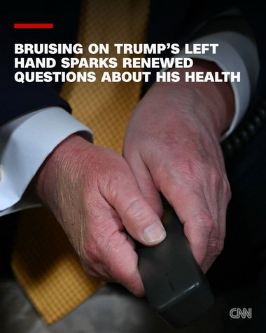 Trump are de mult timp vânătăi pe mâna dreaptă, despre care CNN a relatat că existau înainte de întoarcerea sa la Casa Albă. Dar acestea au atras mai multă atenţie după ce a început să încerce să le acopere cu fond de ten gros şi bandaje sau să le ascundă de camere cu cealaltă mână – mişcări care nu au făcut decât să sporească suspiciunile.